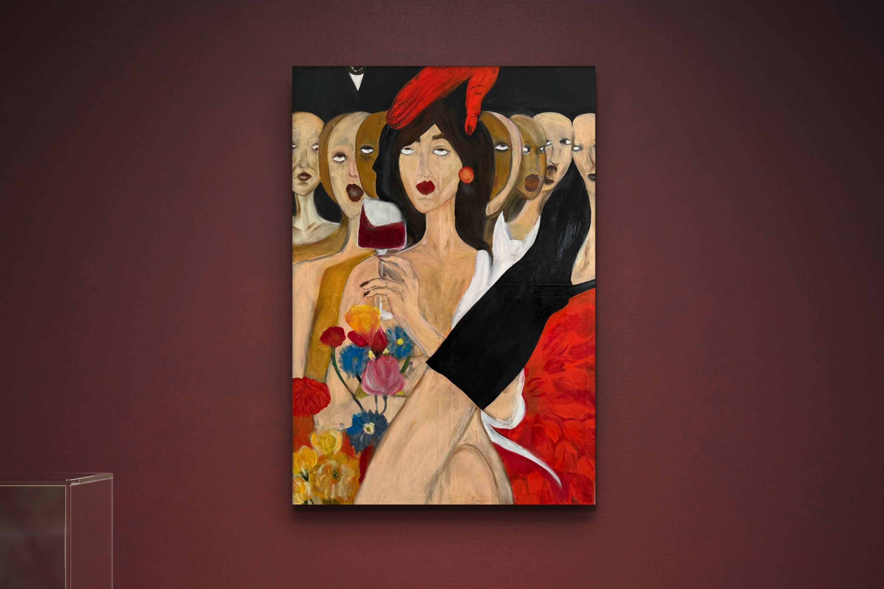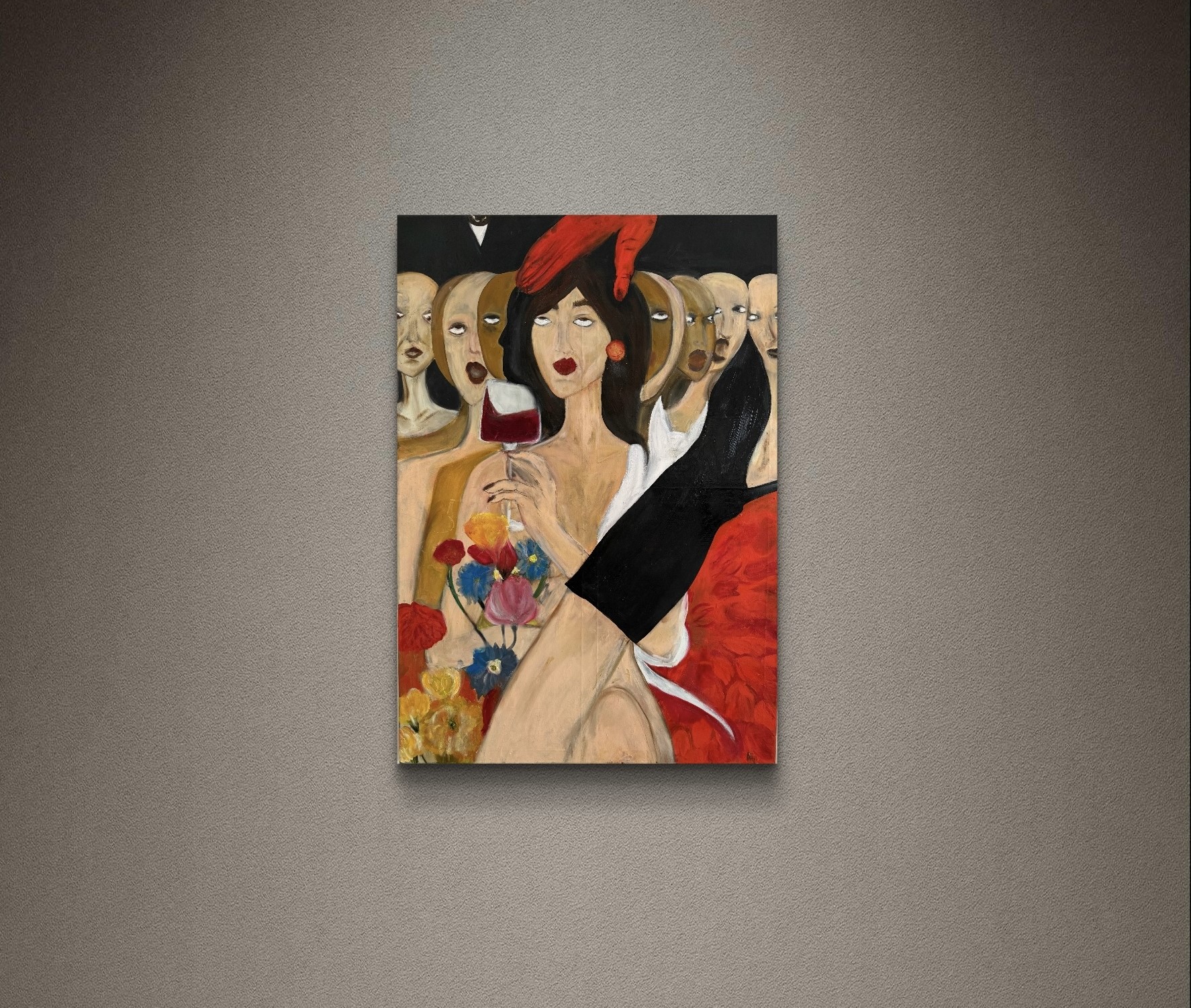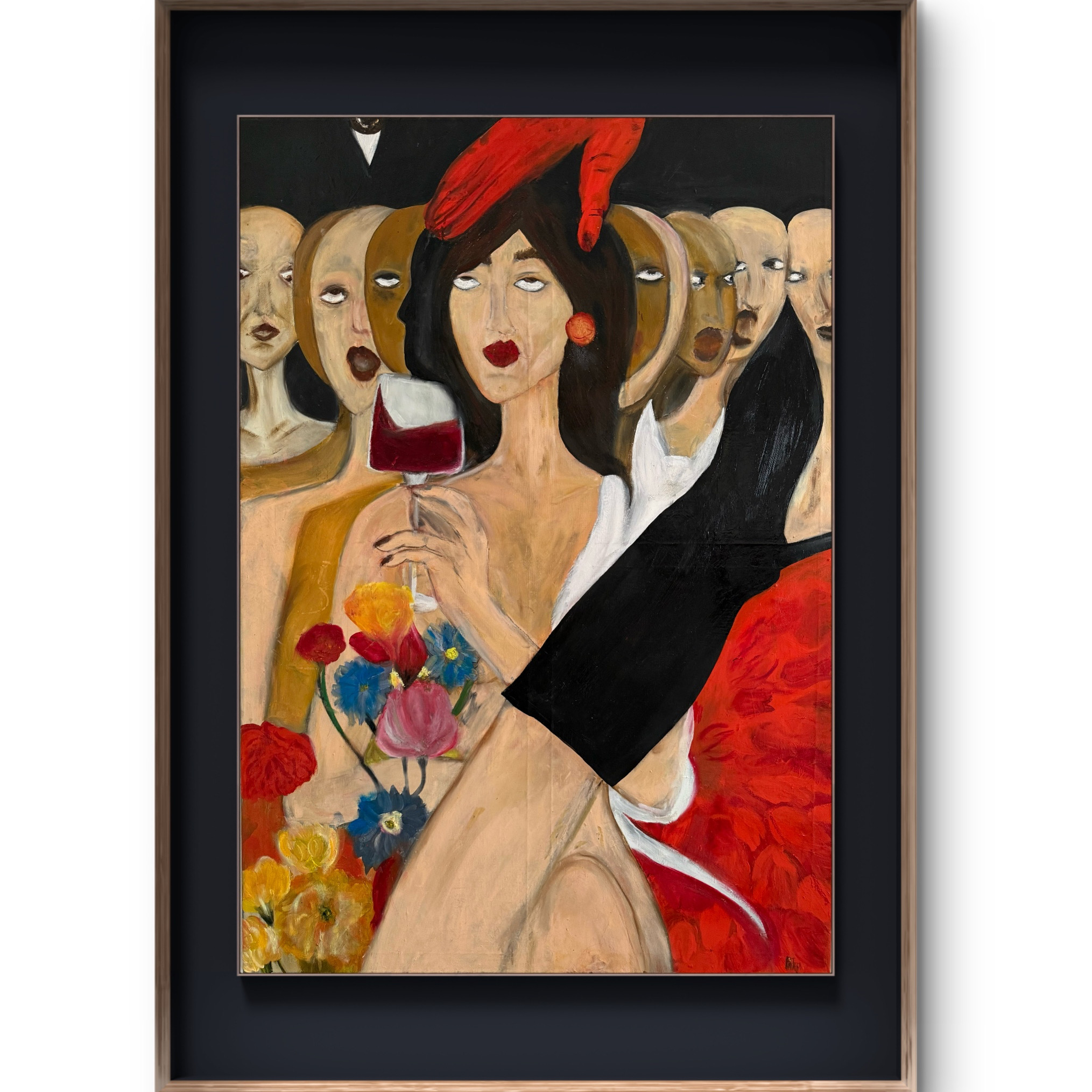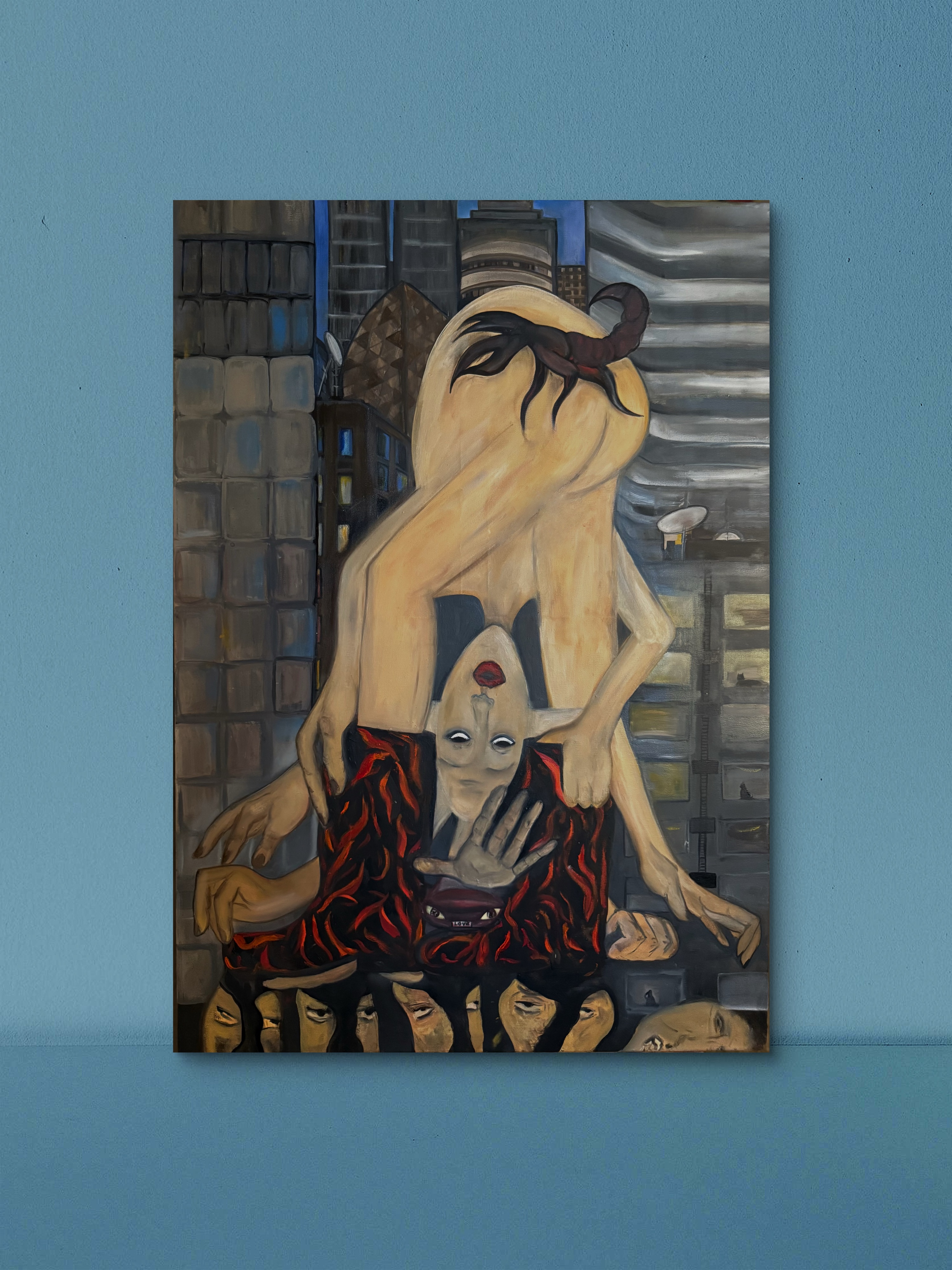 The faceless figures behind her act as a quiet stand-in for society itself. They are always there watching, judging, and expecting yet they remain indistinct and anonymous. The red hand reaching down toward her can be read as both authority and interference: a force from the outside that influences how she is perceived and, perhaps, how she feels compelled to present herself.