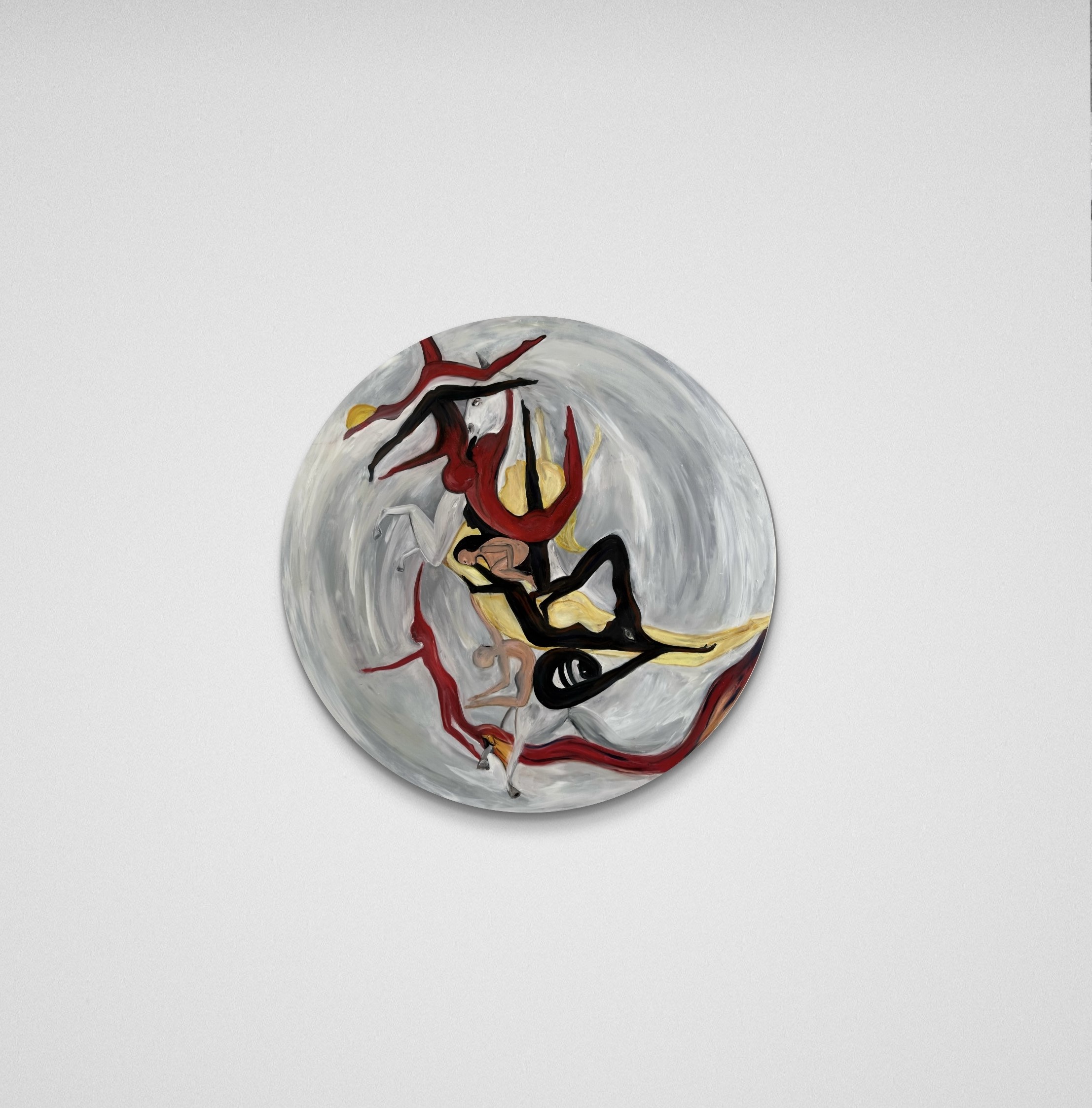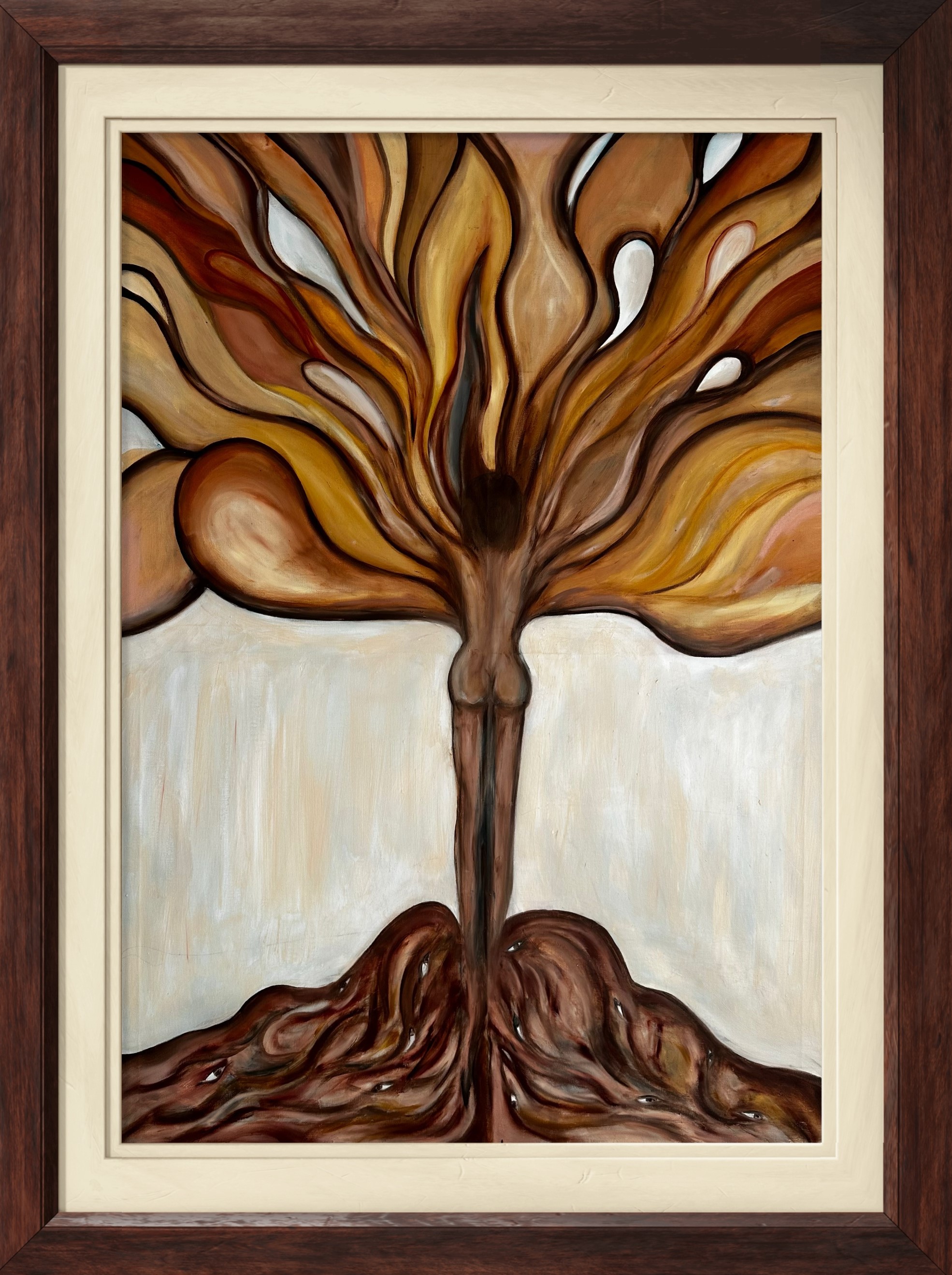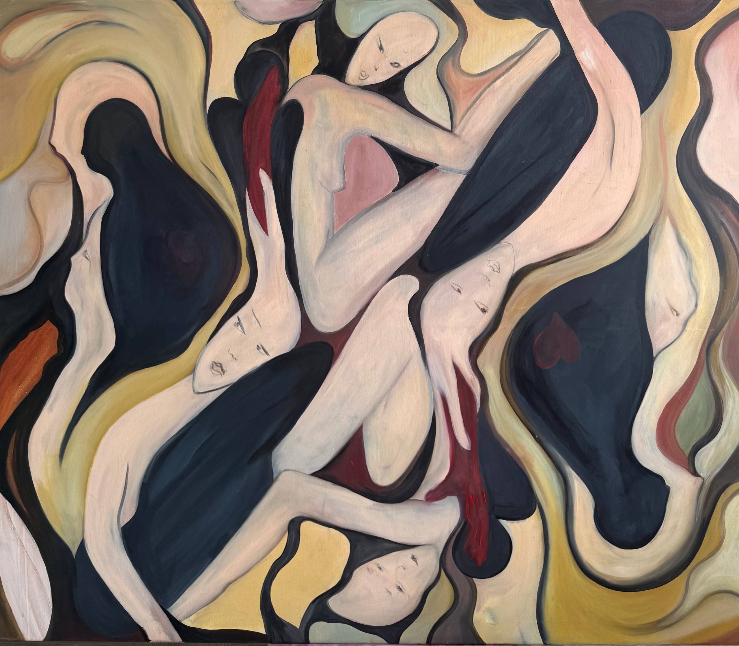 The duality of presence and absence, the ways in which shadows and light intertwine to shape identity. The central figure sits in stillness, yet around them flows a chorus of elongated bodies, part human, part spectral. They lean in, reach out, surround, and echo the figure’s existence, suggesting that we are never solitary but always in conversation with unseen parts of ourselves.