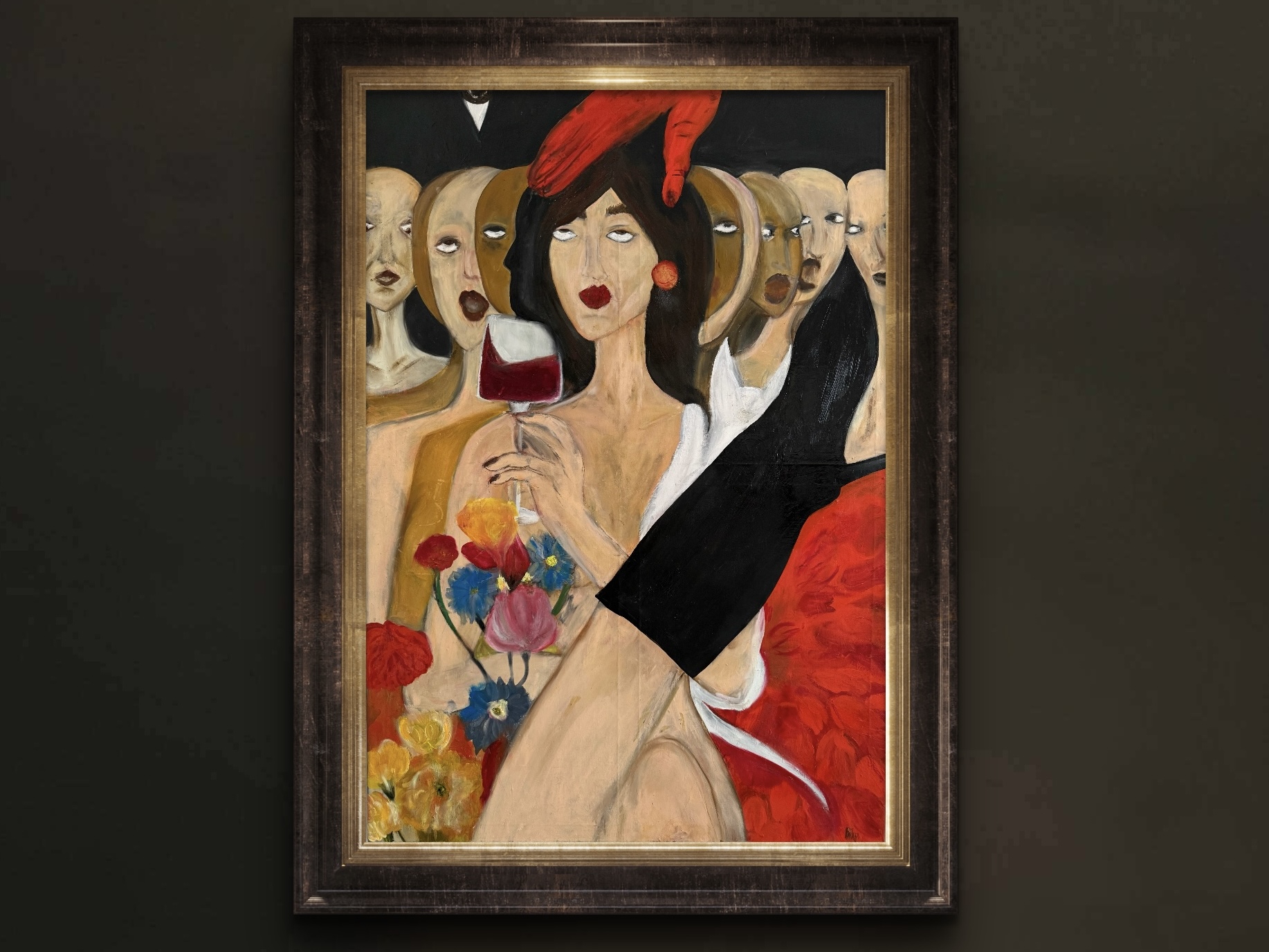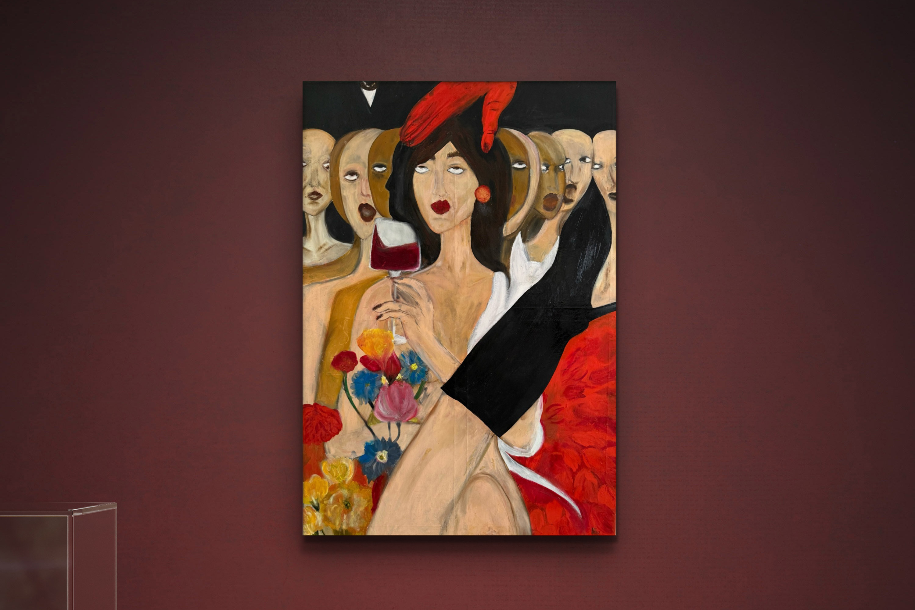 The faceless chorus behind her operates as a silent social audience: constantly present, watchful, and demanding, yet perpetually anonymous. The red hand descending toward her evokes both authority and intrusion, an external force that influences how she is perceived and, ultimately, how she is expected to exist and perform within that gaze.