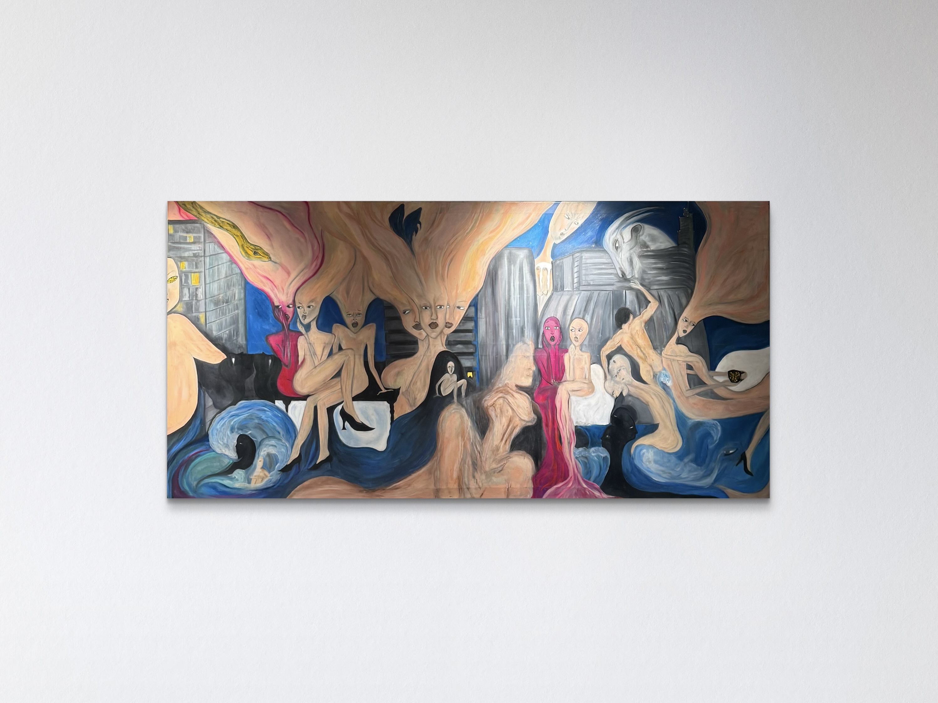 This work speaks of total immersion of the body, the senses, and consciousness dissolving into a single experience. At the center stands a female figure, naked and exposed, surrendering herself to a current that both carries and erases her. She is supported and undone at the same time…